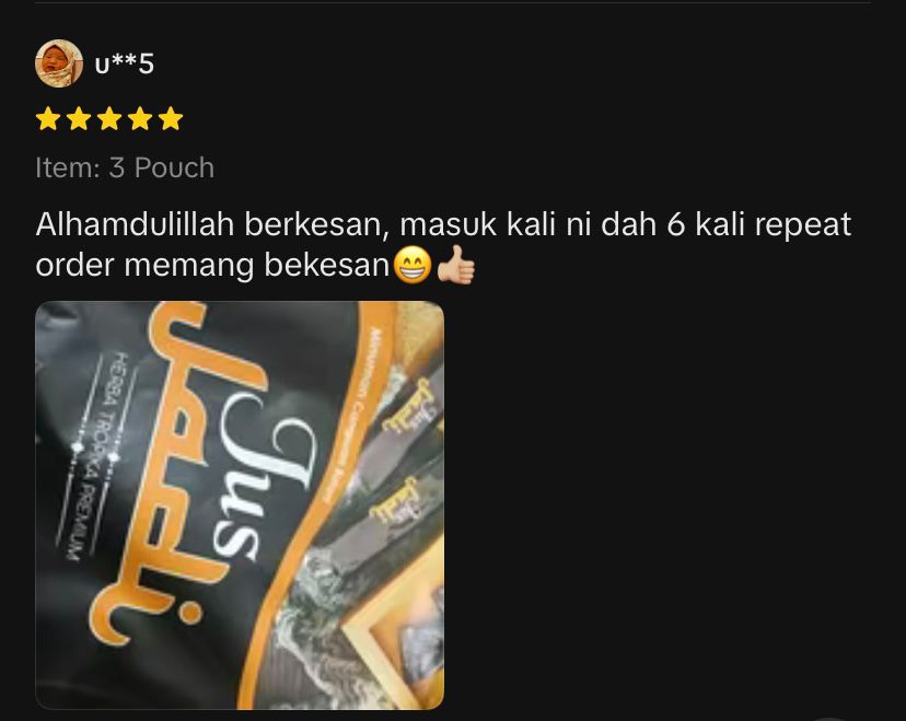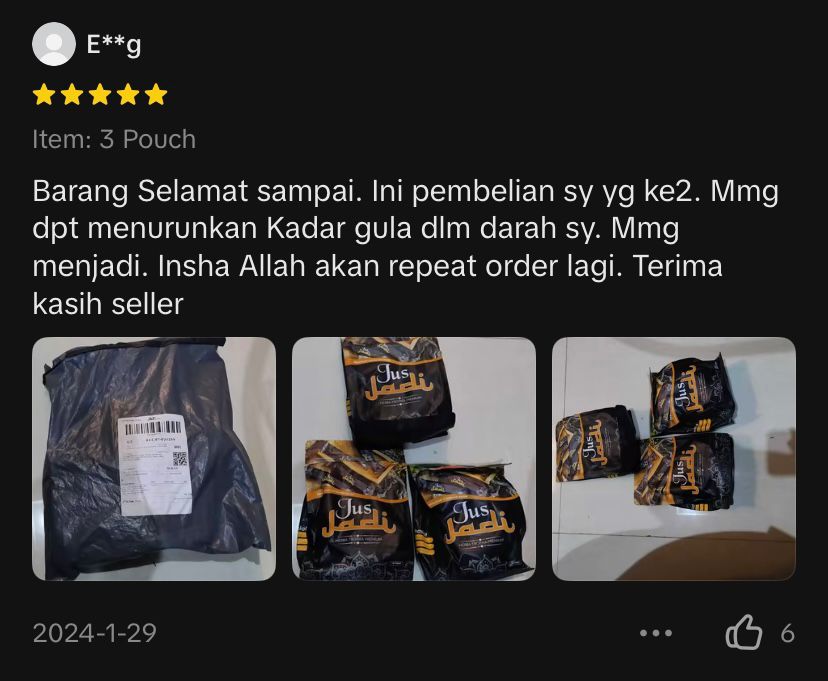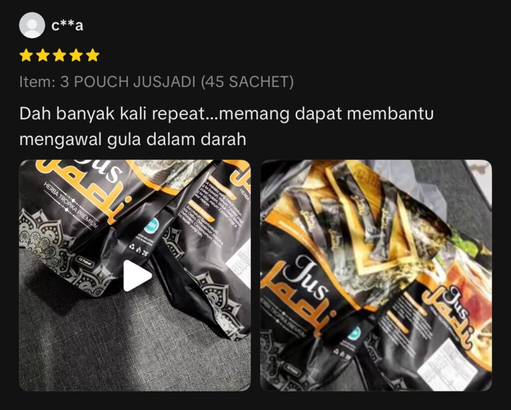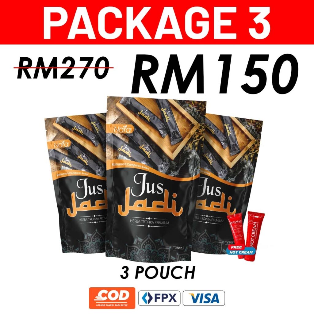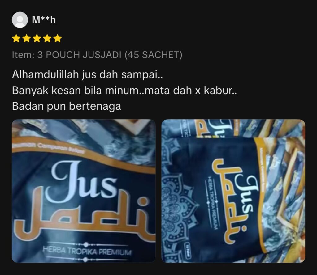 Jus Jadi mengandungi herba semula jadi seperti Tapak Raja, Tebu Gajah, Kayu Manis, Halia Bara dan herba hutan terpilih yang diuji secara tradisional dan saintifik.