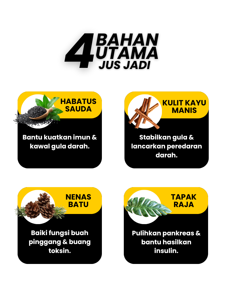 Dengan gabungan 4 BAHAN utama menjadikan Jus Jadi pilihan mudah untuk bantu kawal bacaan harian anda.